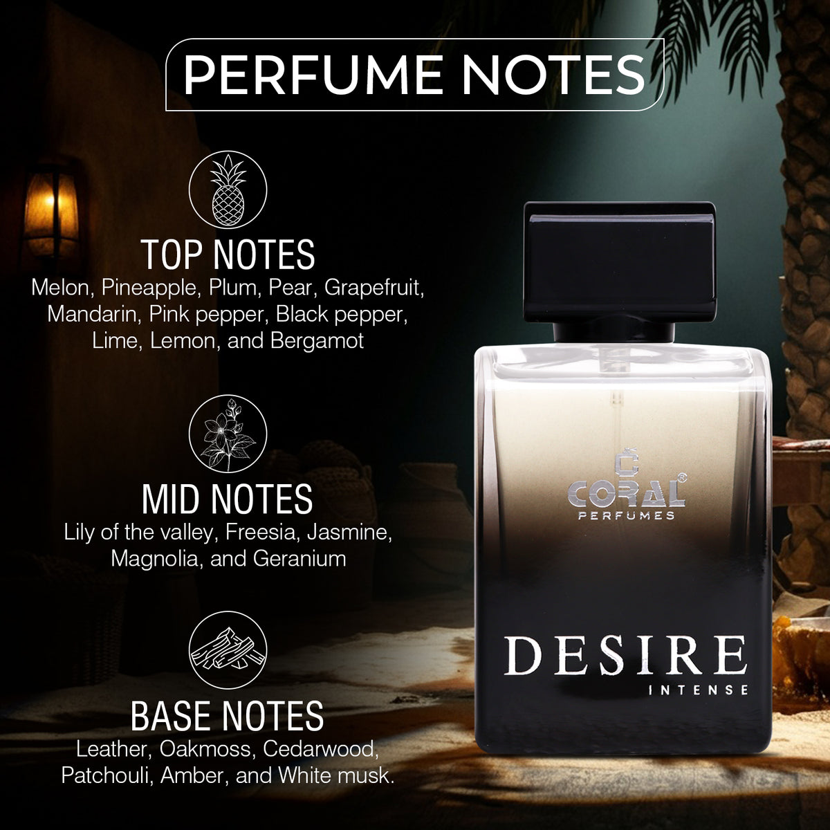 Unleash the power of intensity with Coral Desire Intense Eau de Parfum for Men — a rich, magnetic fragrance for the modern gentleman. Blending refined sophistication with bold character, this scent takes you on a sensory journey. From the first spray, invigorating citrus and spicy accords spark excitement, which then transitions into a heart of aromatic woods and warm florals. Finally, a deep, sensual base of amber, musk, and exotic resins leaves a lasting impression that lingers well into the evening.