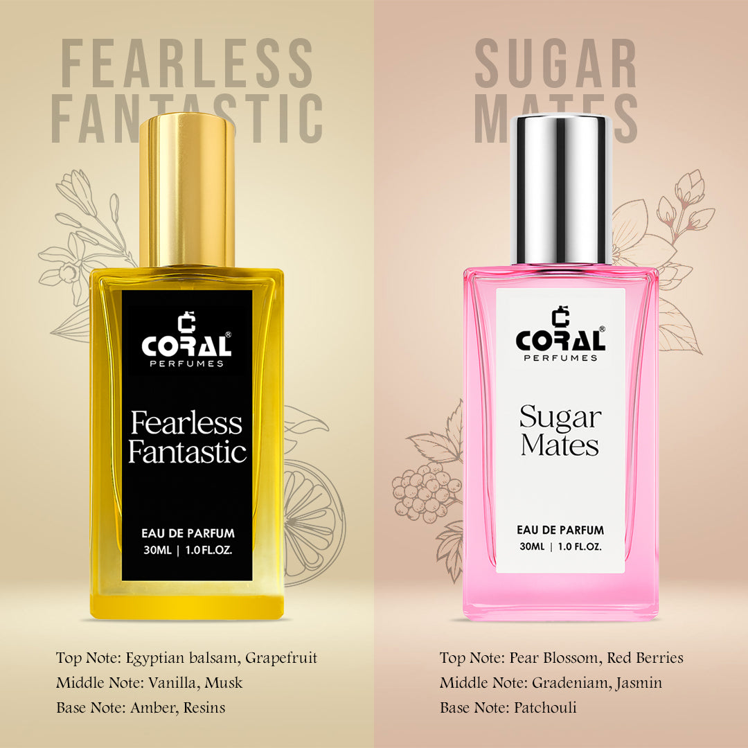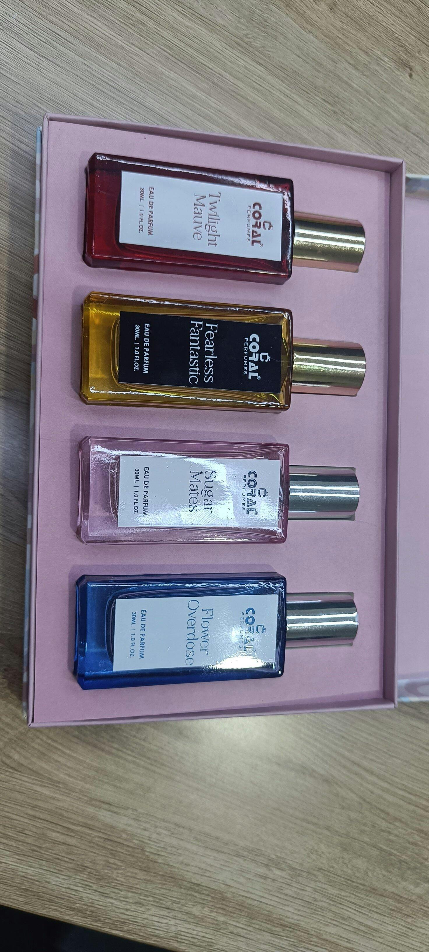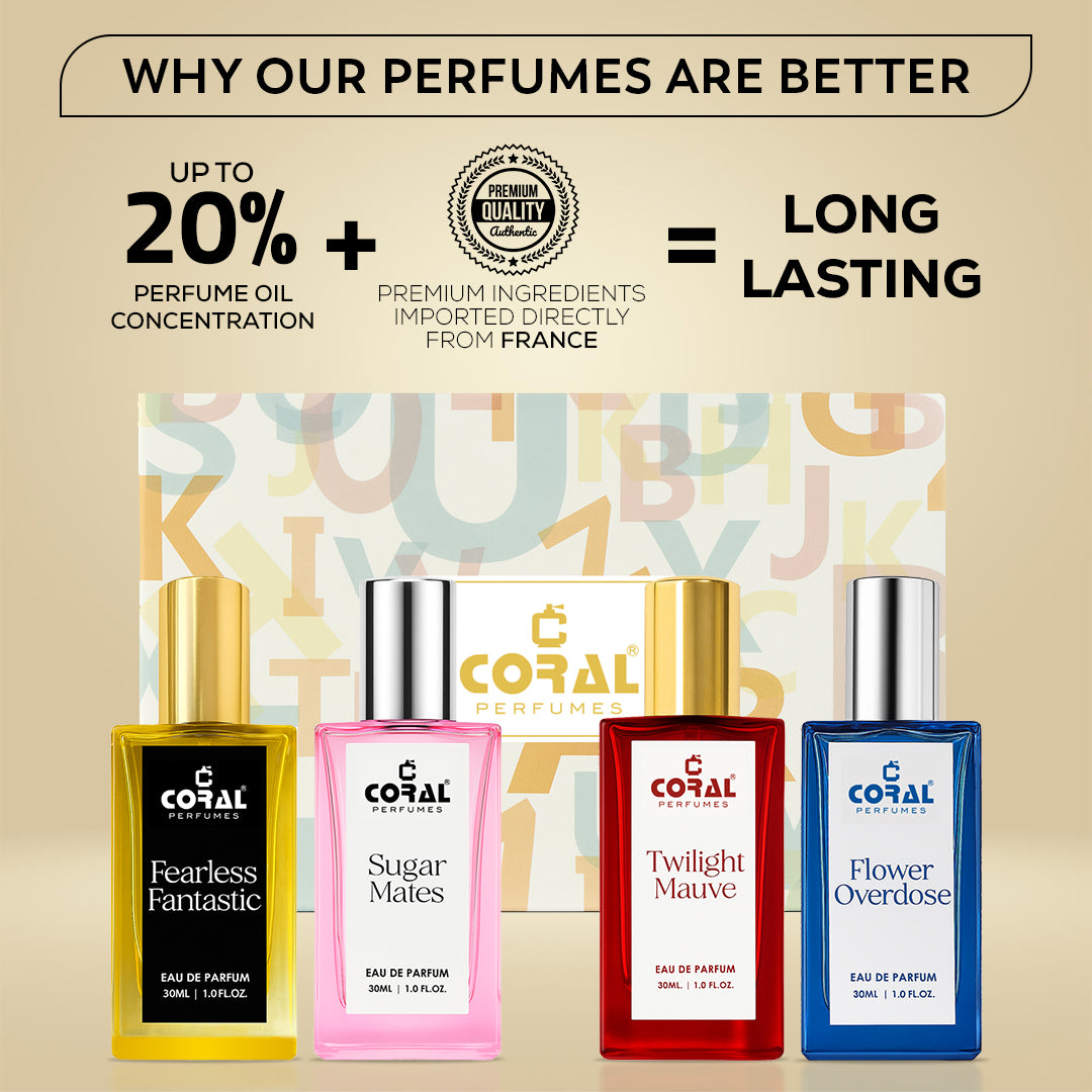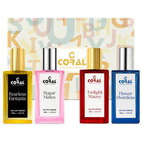 The Coral Gift Set for Women – 4 x 30ml Eau de Parfum is a premium collection of four long-lasting fragrances: Fearless Fantastic, Sugar Mates, Twilight Mauve, and Flower Overdose. Perfect as a gift set for festival celebrations, corporate gifting, birthdays, anniversaries, and weddings, this elegant collection features floral, fruity, and amber accords. Compact and travel-friendly, it’s a luxurious choice for every special occasion.
